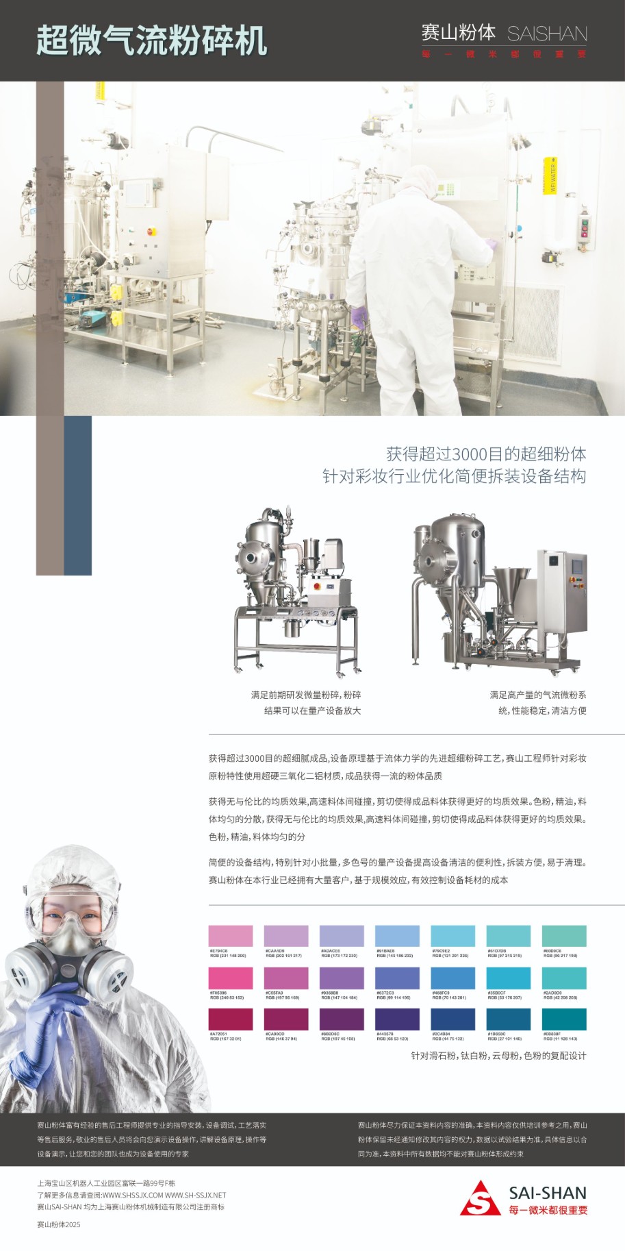 气流粉碎工艺已经成为粉类化妆品原料的典型工艺,气流粉碎工艺可以帮助粉类化妆品提高皮肤触感,消除颗粒感。同时提高压片紧实度。赛山粉体在本行业已有超过30套以上的应用,涵盖从试验级至量产级的设备。凭借多年服务于客户累计的经验,赛山粉体可以为客户设计针对物料性质的成熟应用流程。同时赛山粉体提供1:1的试验机,为客户提供设备粉碎性能的验证。